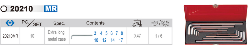 W zestawie znajduje się 10 kluczy o rozmiarach [mm]: 3, 4, 5, 6, 7, 8, 10, 12, 14, 17.